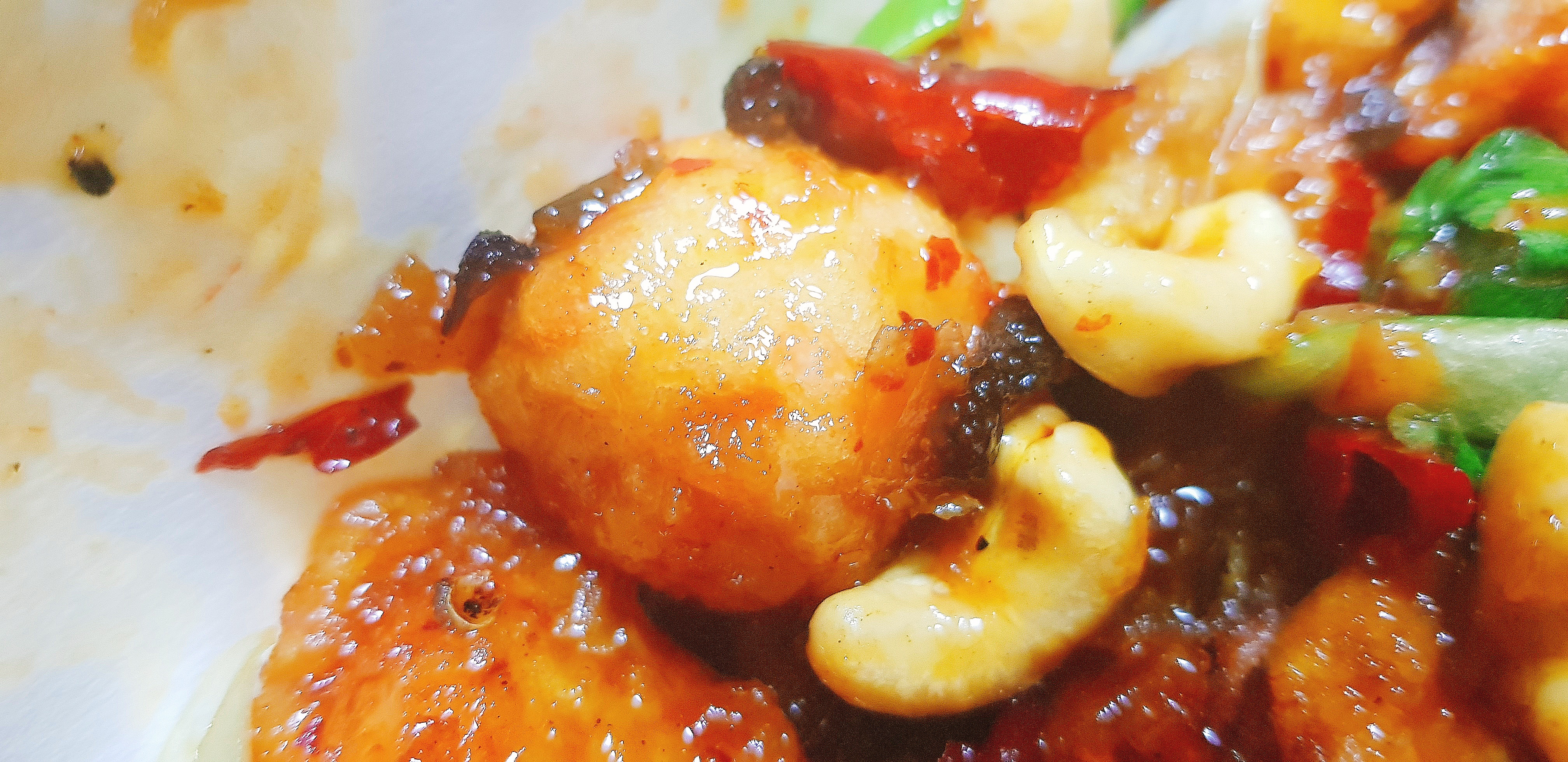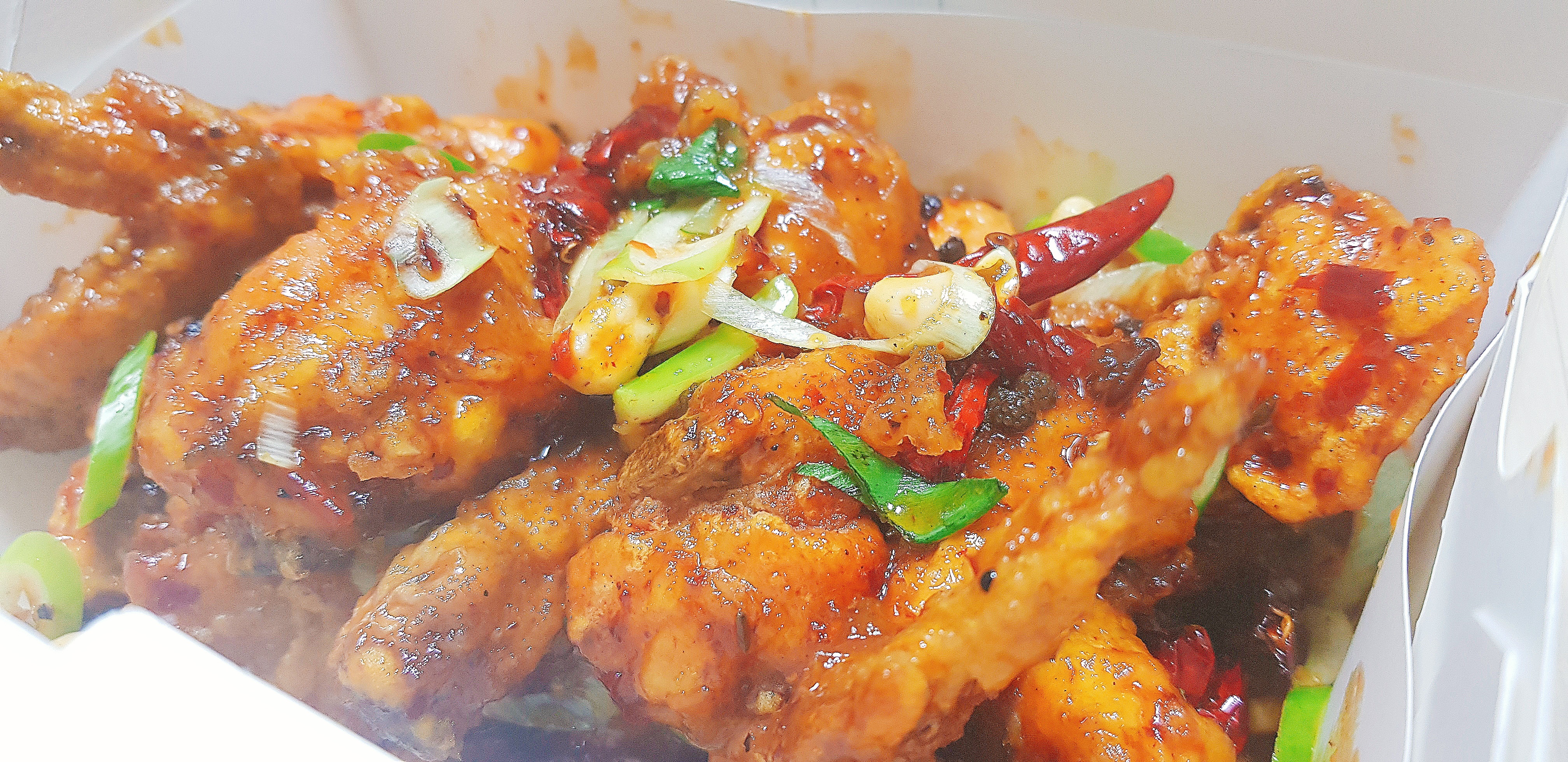 전체적인 비주얼을 살펴봅니다. 소스가 발려있는 치킨 위에 송송썬 파, 붉은 고추, 산초와 캐슈넛이 토핑되어 있습니다.