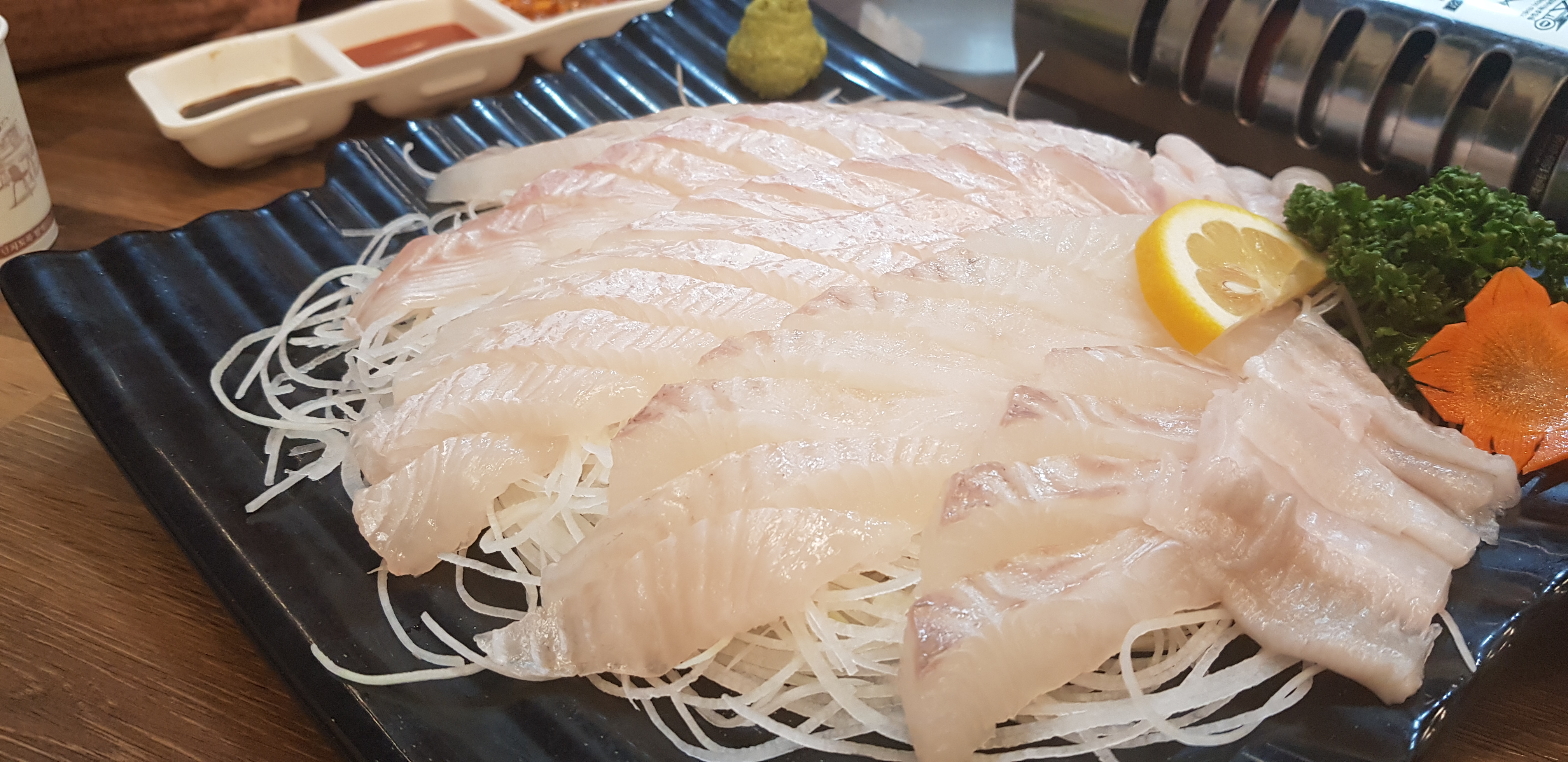 - 기본 반찬을 거의다 먹어갈 즈음 드디어 나타나는 광어회 한 접시의 자태(체감상 10분 까진 안 걸린 느낌입니다)